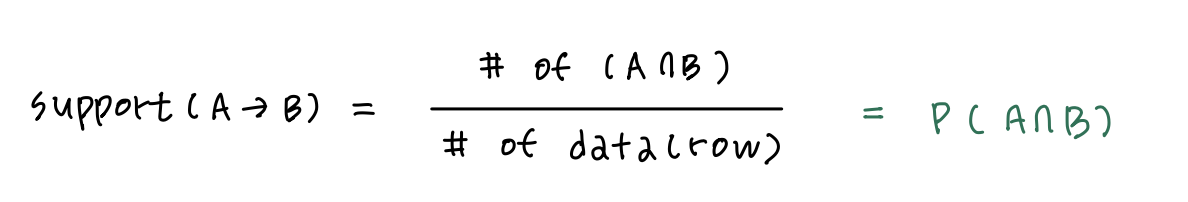 지지도는 아이템이 동시에 발생할 확률이다. 즉 전체 데이터 중 규칙(A, B)를 포함하는 데이터의 비율을 의미한다. 확률이므로 값은 [0, 1] 사이의 값을 가지며, 0에 가까울수록 자주 발생하지 않음을, 1에 가까울수록 자주 발생하므로 A와 B사이의 관계가 중요하다는 것을 의미한다. support(A-> B)와 support(B -> A)는 차이점 파악이 불가능하다.