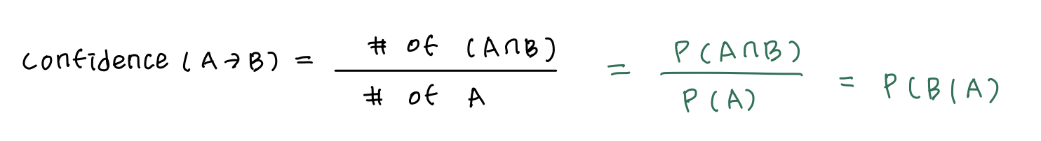 신뢰도는 특정 아이템 A를 선택했을 때, 다른 아이템 B를 선택할 확률이다. (A, B)의 관계를 가정하고, A를 선택한 사람이 B를 선택한 비율이다. 신뢰도도 확률이므로 [0, 1] 사이의 값을 가진다. A에 대한 B의 조건부 확률이기도 하다. 그러므로 1에 가까울수록 A는 B에 많은 영향을 받는다고 할 수 있다. 또 지지도와는 다르게 confidence(A -> B)와 confidence(B -> A)는 다른 값을 가진다.