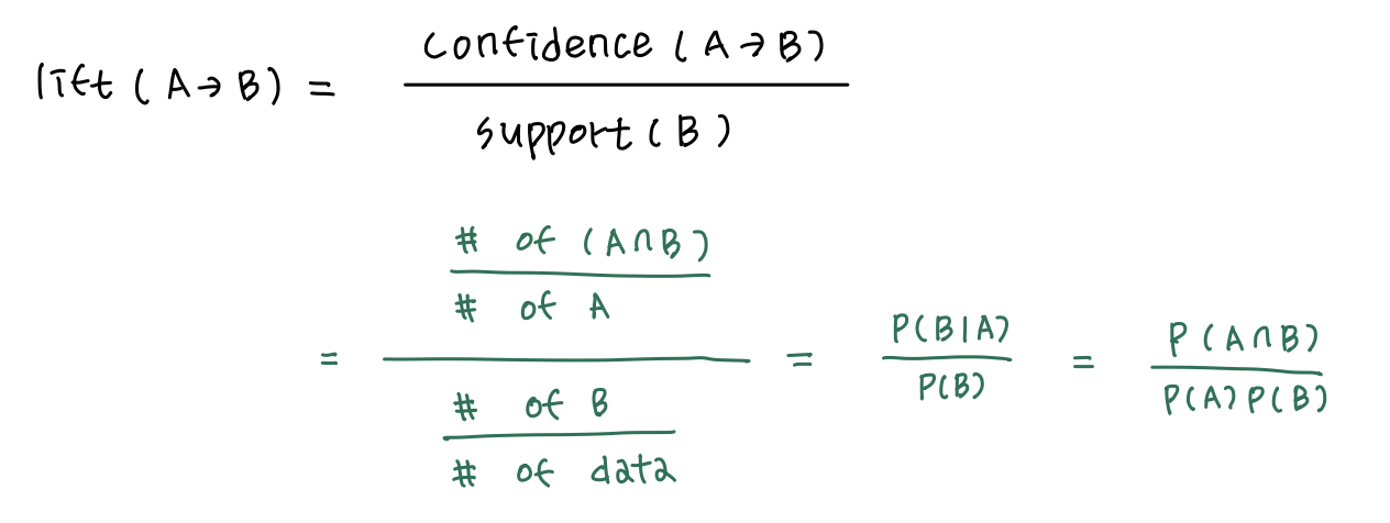 - lift(A -> B) = 1: 독립, 관계 없음 (A, B 각각의 발생 확률을 곱한 값과 A&B 발생 확률이 같음. 독립 사건)