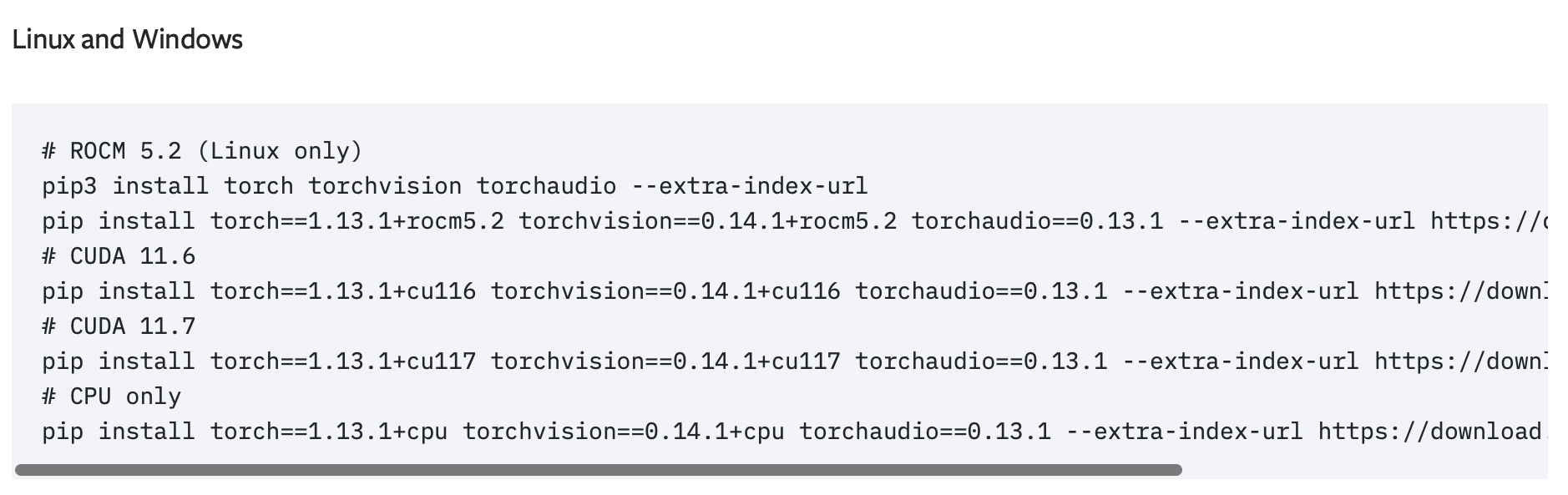 pip install torch==1.13.1+cu116 torchvision==0.14.1+cu116 torchaudio==0.13.1 --extra-index-url https://download.pytorch.org/whl/cu116