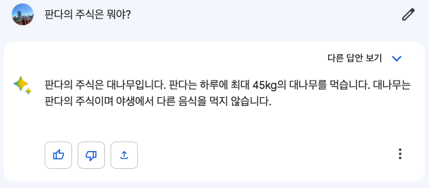 질문에 변화를 줘봤다. 바드는 드디어 주식을 stock이 아닌 주로 먹는 음식으로 알아듣고, 엄청난 대나무가 주식이라고 대답.