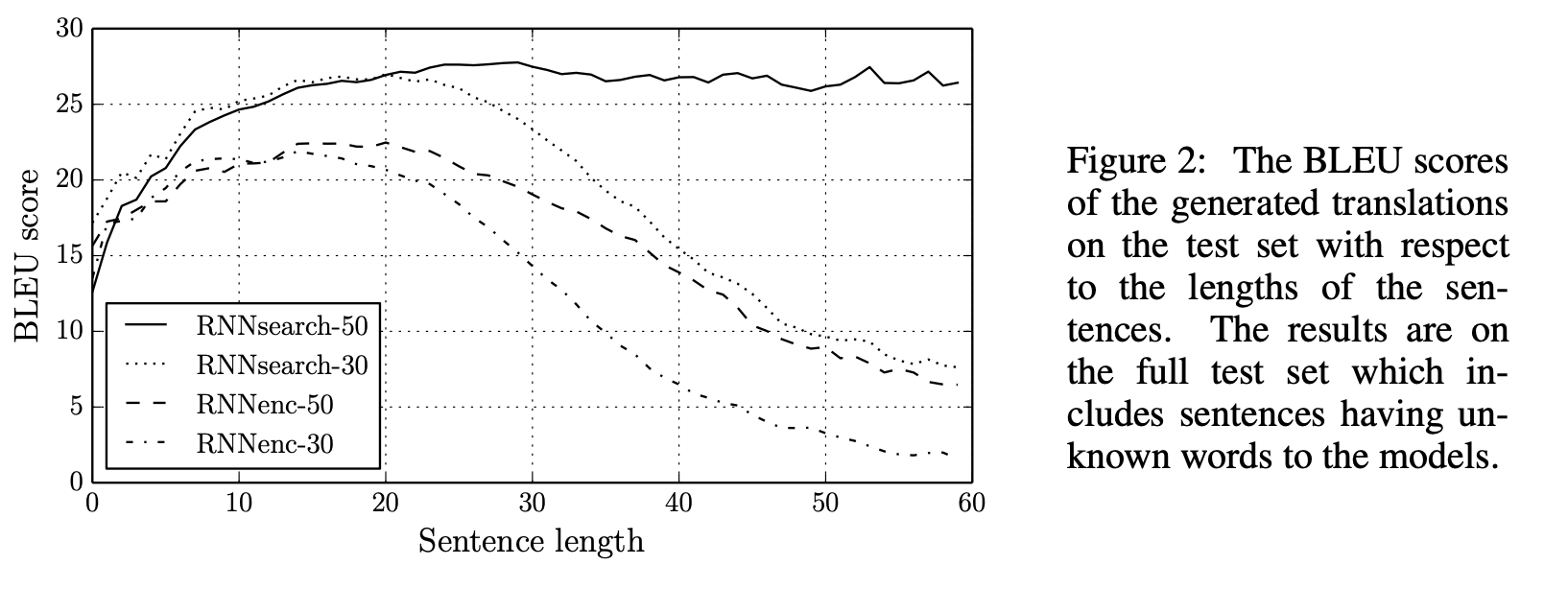 - RNNsearch-50은 입력 문장의 길이가 길어져도 성능이 쉽게 떨어지지 않음