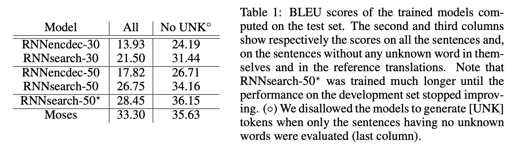 - RNNenc-50 < RNNsearch-30 을 통해 고정 크기 문맥 벡터의 한계를 어텐션 메커니즘으로 돌파한 것을 확인