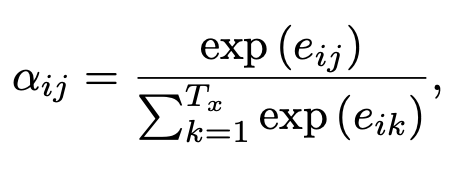 이해한 내용 ➡️ 현재 디코더 출력 시점(i)에 대하여 j번째 토큰의 영향력을 나타낸 것. 다시 말하면, 출력 단어 yi 가 입력 단어 xj 와 정렬되거나, 이로부터 번역될 확률