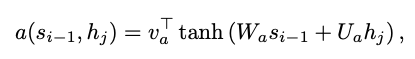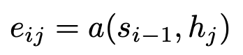 eij는 si-1(직전 출력에 대한 hidden state)과 hj(j번째 annotation)을 기반으로 함. 여기서 a는 alignment(정렬) 모델로 j 주변의 입력과 위치 i의 출력이 얼마나 잘 일치하는지를 점수화함.
