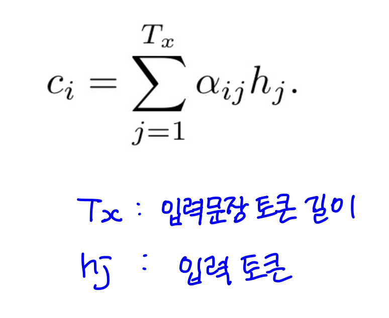 컨텍스트 벡터가 바로 어텐션의 개념에서 설명한 “ 입출력 토큰의 의미적 연결성을 학습하여 반영”하기 위한 벡터이다. 즉, 학습한 의미적 연결성을 반영한 값이다. 이 벡터는 아래와 같이 a와 h의 가중합을 통해 구한다. 이 때, h는 입력 토큰의 상태 값으로 연결성을 반영할 대상이고, a가 의미적 연결성을 표현하는 값이다.