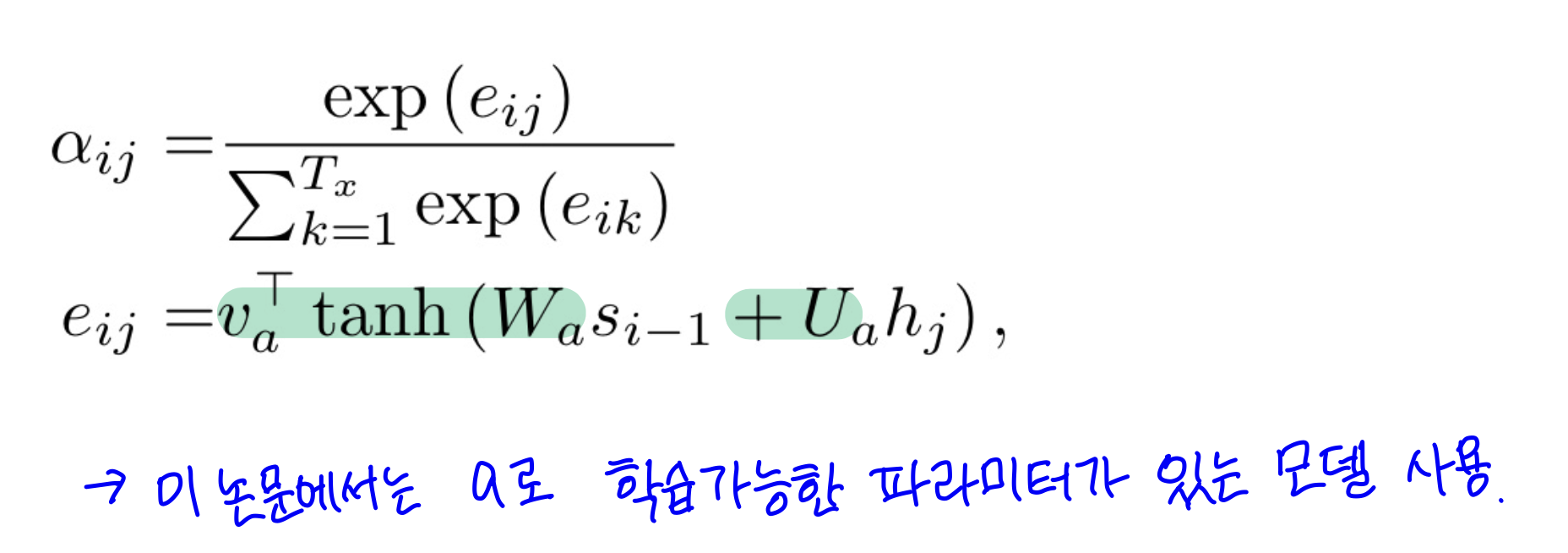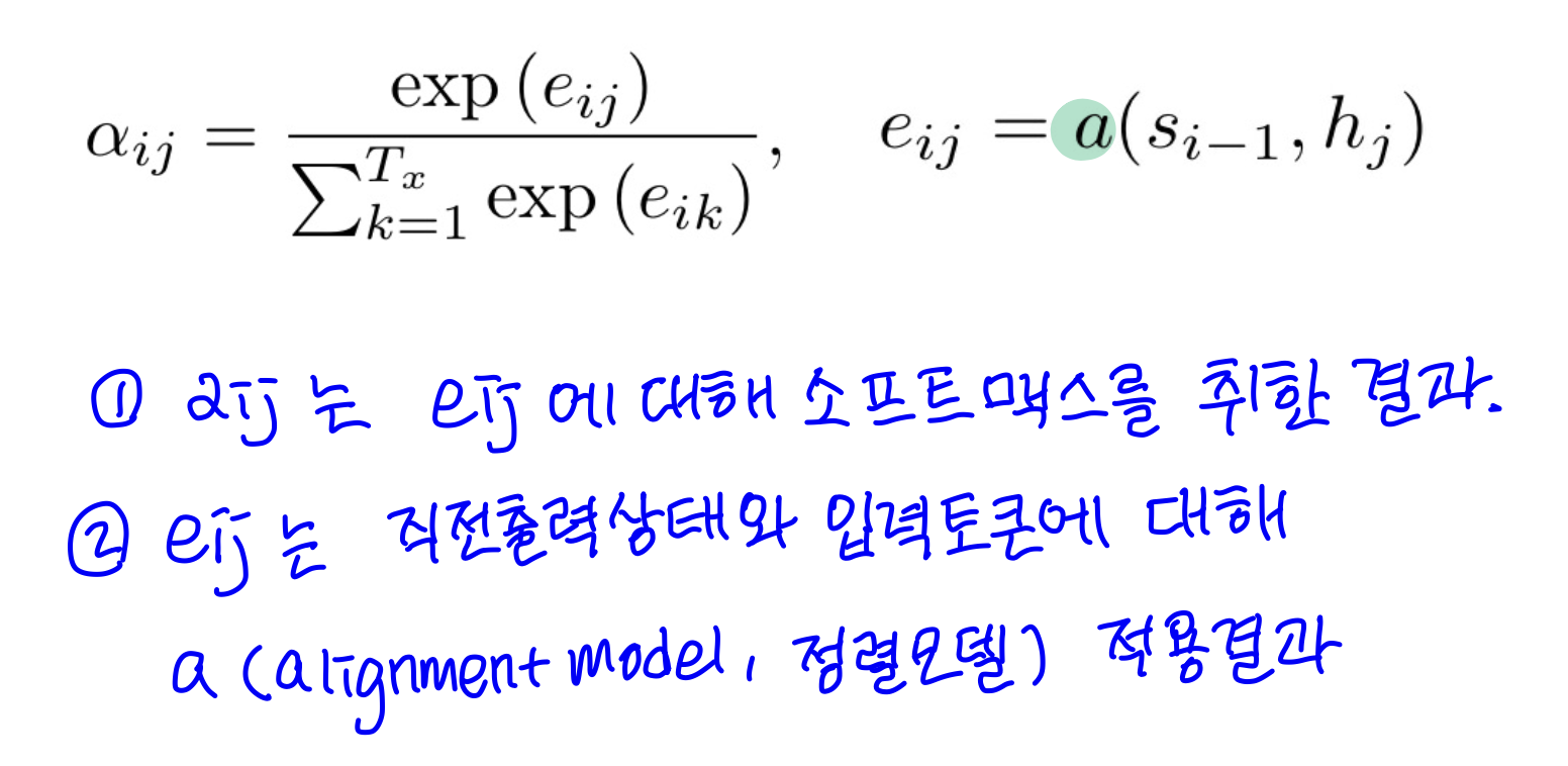 a는 어떤 값(e)에 대하여 소프트맥스를 적용한 값이다. 그리고 e는 이전 상태값과 입력 토큰의 관계를 표현하는 값이다. 원 논문에서는 이 관계를 가중치를 통해 학습하고 있으며, 현재는 코사인 유사도, 내적 등으로 구하기도 한다.