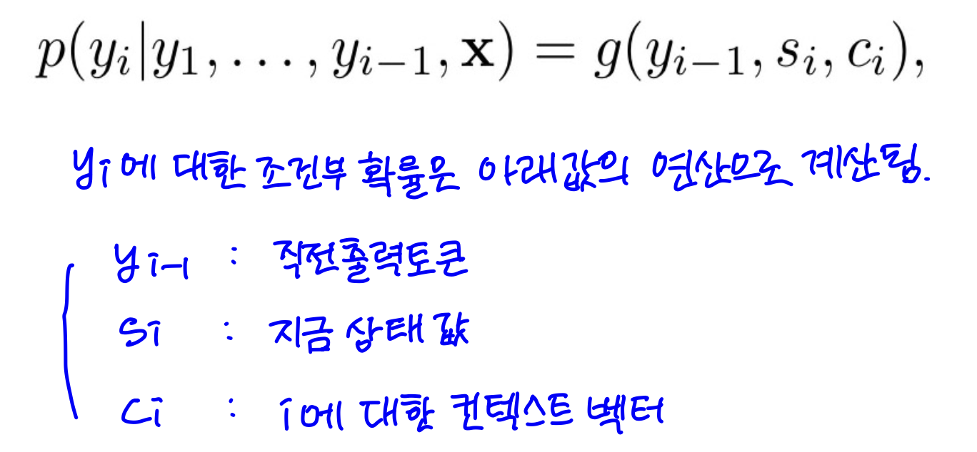 출력 문장의 i번째 토큰 yi의 확률(조건부)은 이전 출력 토큰과 현재 상태값, 컨텍스트 벡터를 디코더 모델에 통과시켜 구할 수 있다. 이 때, 모델은 세 종류의 데이터로 yi의 확률을 계산할 때, 최대화되게 학습된다. 이전 출력 토큰과 현재 상태값은 직관적으로 알 수 있다.