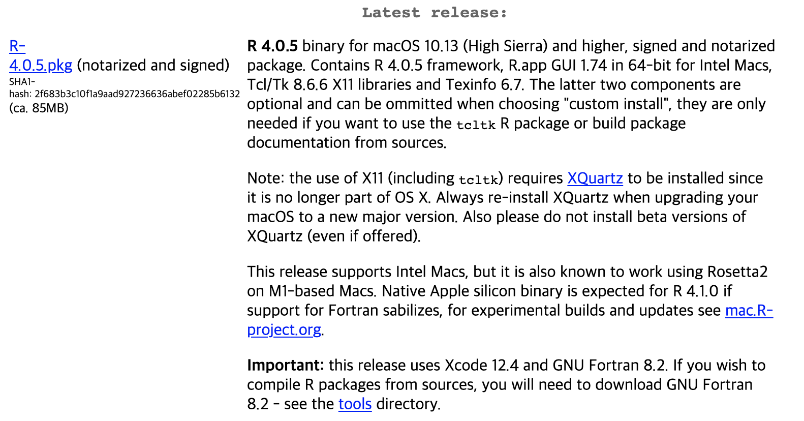 1) R for macos 설치 사이트에 접속하여 R-4.0.5.pkg 설치