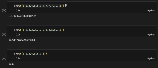 즉, 이 값들은 데이터가 어느 한 쪽으로 치우치거나, 이쁜 정규분포가 아닌 들쭉날쭉한 분포일 때 더 커질 것이다. skewness는 데이터의 치우침만을 반영해야 하므로, m3를 m2인 분산으로 나누어, 들쭉날쭉한 분포에는 덜 반응하고 왜곡의 정도가 계산되도록 의도한 수식같다.
