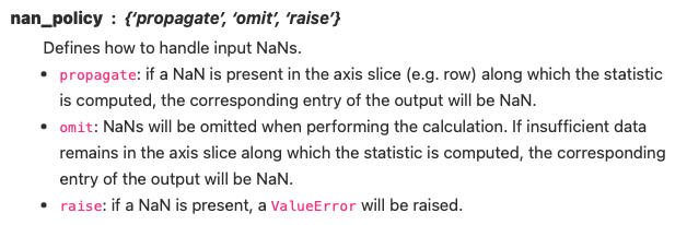 scipy 공식 도큐먼트를 통해 skew 메서드에 결측치 처리 정책 옵션을 줄 수 있는 것을 확인함. 디폴트 옵션으로 nan_policy='propagate'가 설정되어 있어 na이 출력됨을 확인함.