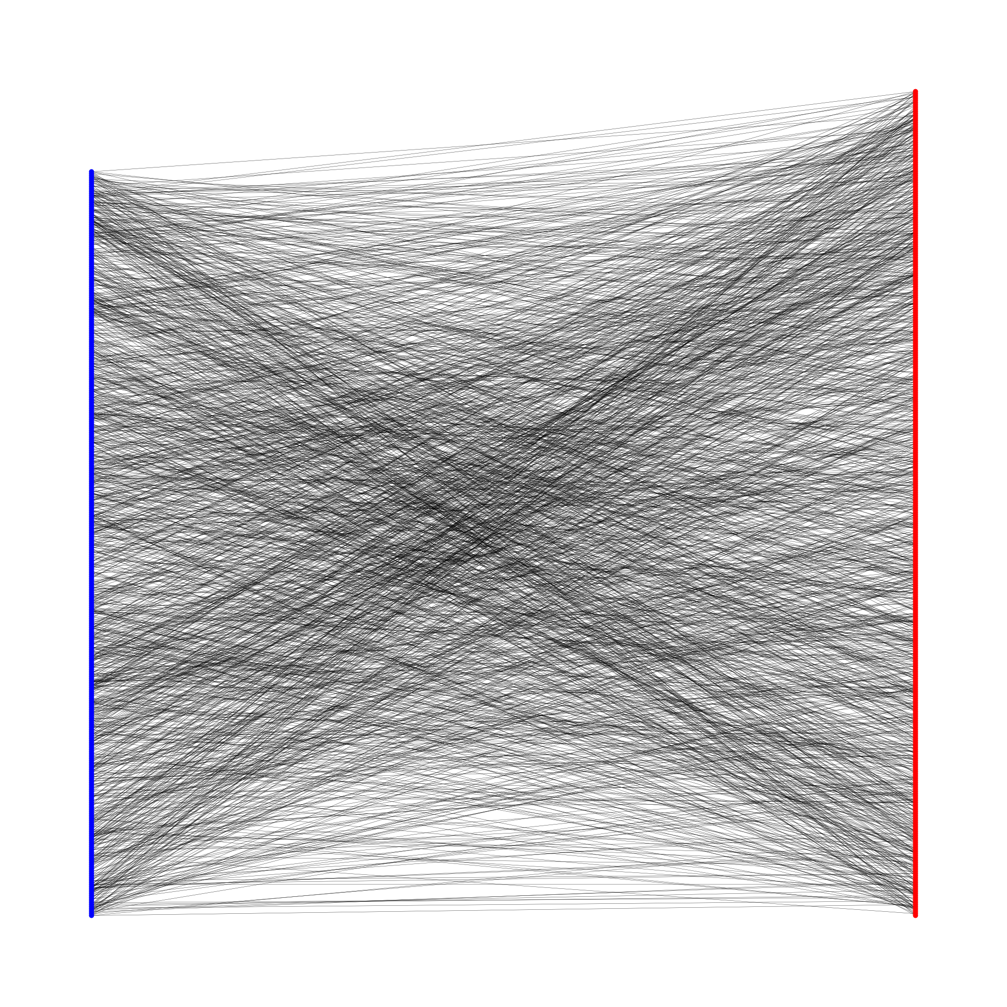 유저 노드를 파란색으로 좌측 정렬하고, 아이템 노드를 오렌지색으로 우측 정렬한 뒤 시각화하면 아래와 같이 예쁜 그림이 그려짐. 비대칭적인 그래프에서는 일부 노드에 연결이 매우 집중된 것을 눈에 띄게 확인할 수 있는데, 이 데이터는 거의 그렇지 않게 나타나고 있음.