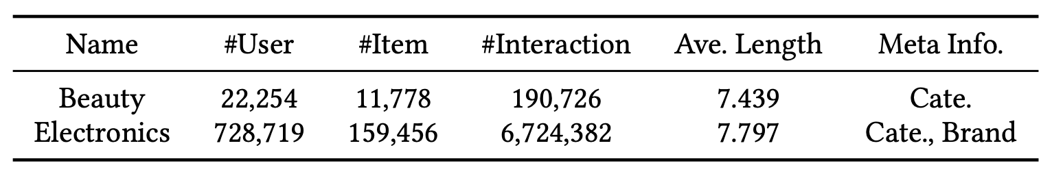 next-item prediction task setup을 따라 0.8:0.1:0.1로 유저 데이터를 나누고 테스트 시퀀스의 마지막 아이템을 예측 타겟으로 함