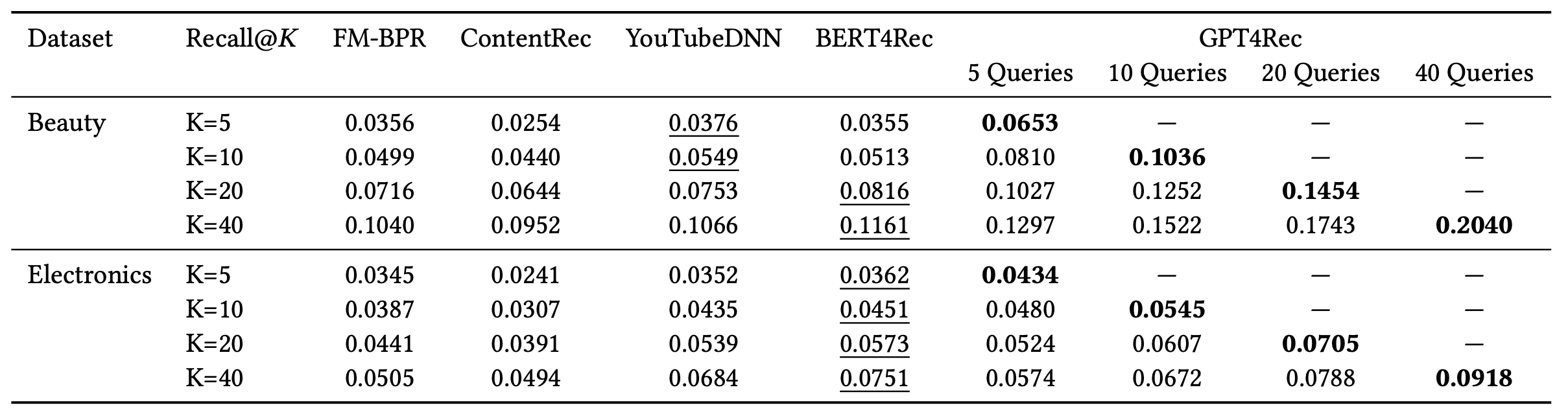 먼저 아이템 제목들로 프롬프트 구성하고, 생성모델이 아이템과 유저 임베딩을 학습할 수 있게 함. 그리고 이 생성 모델이 유저의 관심사를 표현하는 여러 개의 쿼리를 생성. 생성된 쿼리는 검색 엔진을 통해 추천 아이템을 획득하는 데 사용. GPT-2 언어 모델과 BM25 검색 엔진 선택하였으나, 더 좋은 다른 엔진을 써도 됨